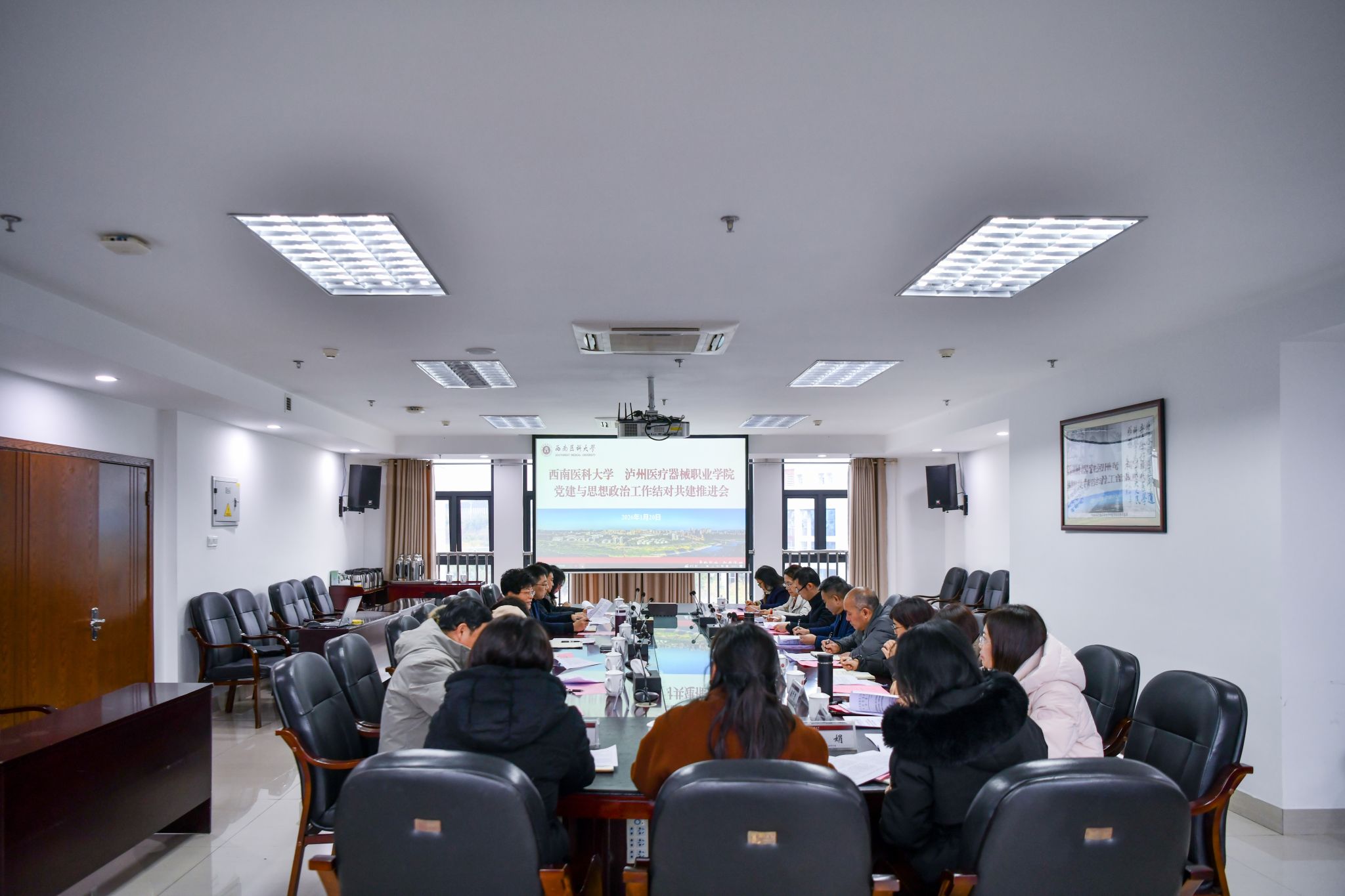 为深入贯彻落实新时代党的建设总要求和新时代党的组织路线,1月20日下午,我校与泸州医疗器械职业学院党建和思想政治工作结对共建推进会在城北校区德诚楼621会议室召开。泸州医疗器械职业学院院长鞠梅、党委书记唐家州一行7人到校研讨结对共建事宜。我校党委副书记蒋通荣出席并主持会议,党委常委、宣传部部长冯天明以及党政办公室、党委组织部、教务处、科技处、教育评价与教师发展中心、马克思主义学院等相关负责同志参加会议。