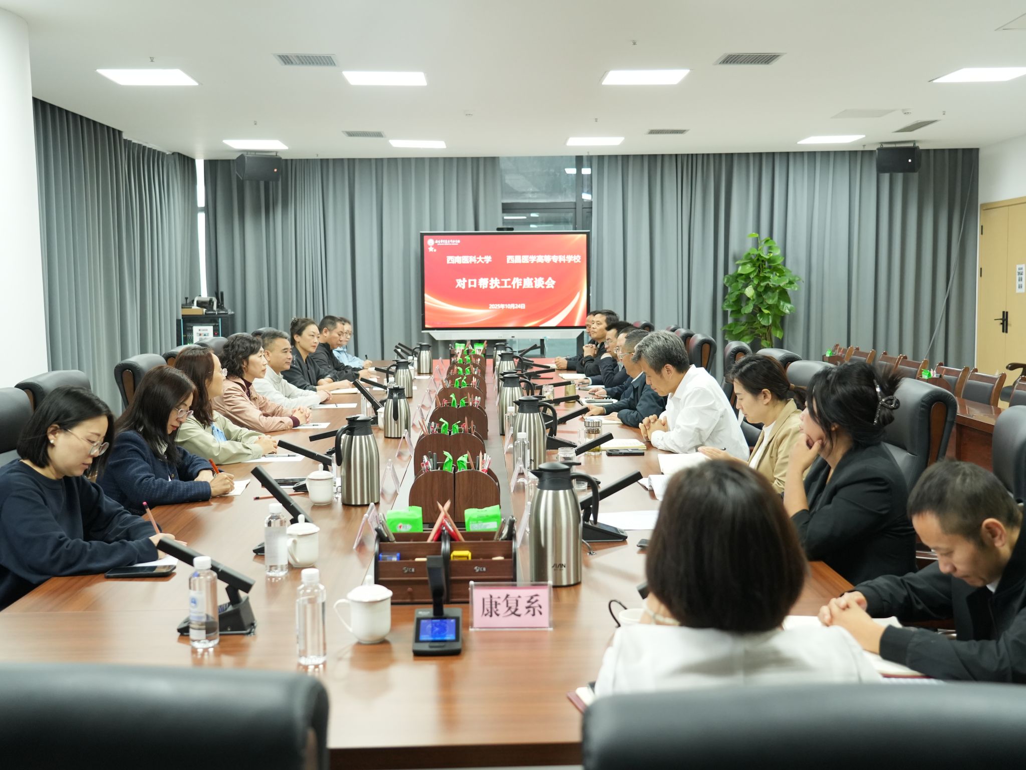 在对口帮扶座谈会上,西昌医学高等专科学校党委副书记、校长许小红介绍了学校发展现状及帮扶需求。双方围绕专业建设、师资赋能、人才培养、科学研究、产业转化等内容展开深入研讨。西昌医学高等专科学校党委书记陈方勇主持会议并表示,西南医科大学的精准帮扶为学校发展注入关键动能,期待后续深化协作、共促成长。西昌医学高等专科学校党委委员、副校长张春来,党委委员、副校长程志敏参加会议。